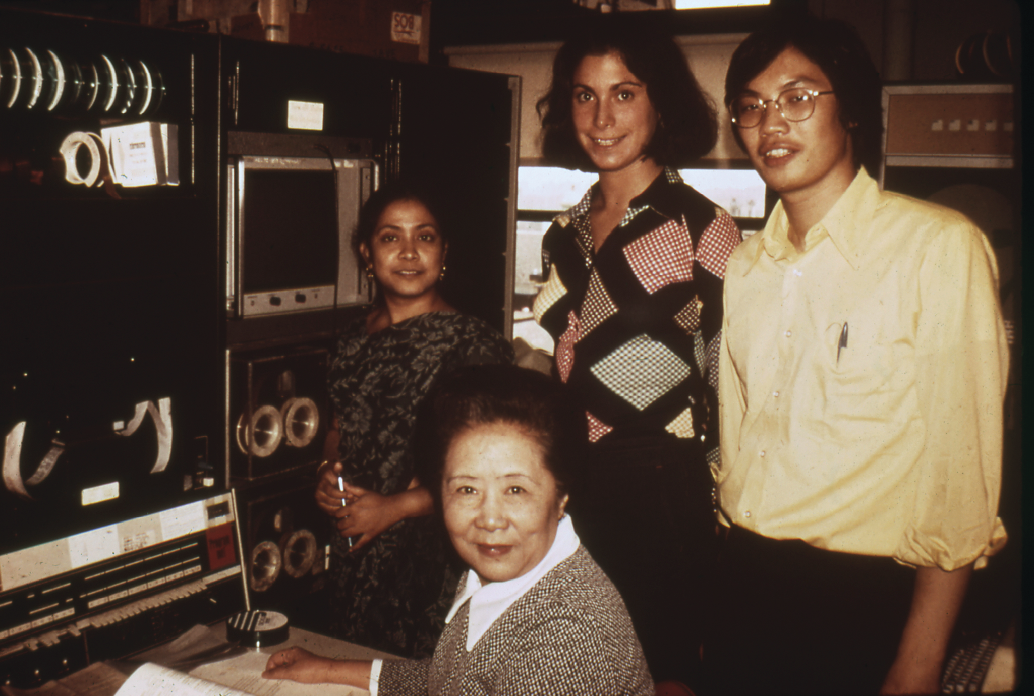 Wu with graduate students in the laboratory at Columbia University, circa 1975. (From the American Association of Physics Teachers, courtesy of the AIP Emilio Segrè Visual Archives.)
