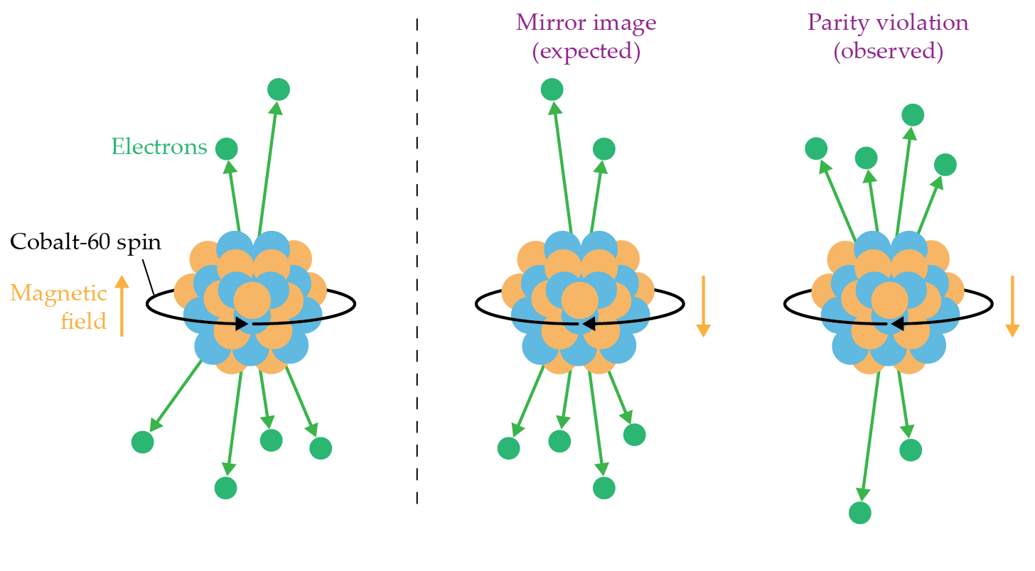 Parity violation was demonstrated in an experiment led by Chien-Shiung Wu.7 She and her colleagues measured the emission of beta-decay electrons from cobalt-60 nuclei polarized in an applied magnetic field. If the weak interaction conserved parity, then the direction of electron emission should be independent of the direction of the nuclear spin. The observation of a dependence on the polarization direction of the nuclei confirmed the theory that weak interactions do not obey mirror symmetry.