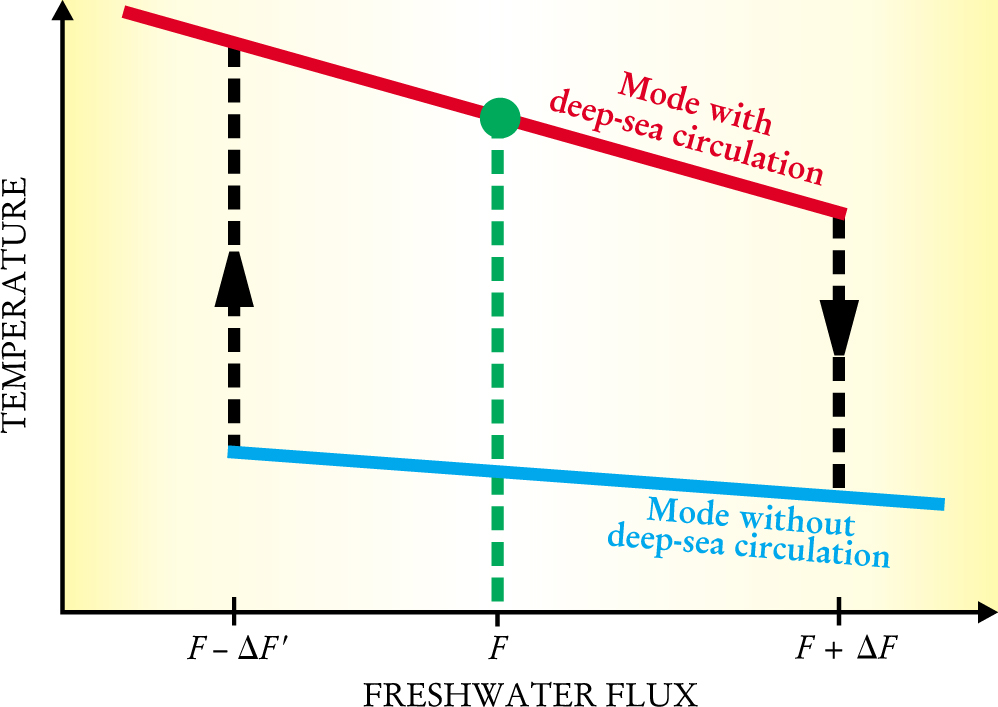 According to models, a slight increase in the freshwater flux above the modern level F produces a decrease in the NADW convection and a moderate cooling in the North Atlantic (see the upper part of figure 1). However, the system flips to another state once the flux reaches a threshold value F + ΔF. That state, which has no deep convection, is characterized by surface temperatures up to 6°C lower in and around the North Atlantic. Such a drastic transition, known as a bifurcation, can occur very rapidly—over a period of decades. The cold state is also quite stable: The freshwater flux must be decreased significantly to another threshold value (F – ΔF′) before the system can flip back to its original warm state.