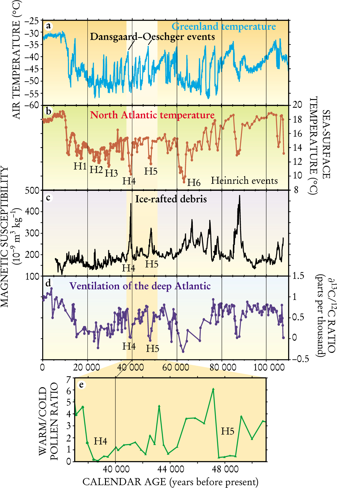 Figure 2. Climatic and oceanographic variations in and around the North Atlantic Ocean during the past 110 000 years, as revealed in Greenland ice cores and North Atlantic sediment cores obtained off the Iberian Margin. Time progresses from right to left. (a) The Greenland air temperature based on isotope thermometry shows abrupt warm periods called Dansgaard–Oeschger events. The records were obtained from ice cores by Willie Dansgaard, Sigfus Johnsen, and their collaborators in Copenhagen, Denmark. (b) The sea-surface temperature in the North Atlantic shows episodes of drastic cooling called Heinrich events. This record compiles our results on biomolecular thermometry with long-chain (37-carbon) organic molecules called alkenones measured on two sediment cores at CEREGE (Aix-en-Provence, France). (c) The presence of ice-rafted debris, which was revealed in the sediment magnetic property measurements by Nicolas Thouveny and colleagues at CEREGE, is correlated with the drastic cooling in Heinrich events. (d) The ventilation of the deep Atlantic has been reconstructed by Nicholas Shackleton and his colleagues in Cambridge, UK, from variations in the carbon-isotope ratio contained in bottom-dwelling benthic foraminifera found in the sediment cores. (e) A qualitative measure of the continental climate is the ratio of pollen from temperate plants to that from cold-climate plants, as measured in marine sediments by Maria-Fernanda Sanchez-Goni and her collaborators in Bordeaux, France. The methods used to generate these records are described in the