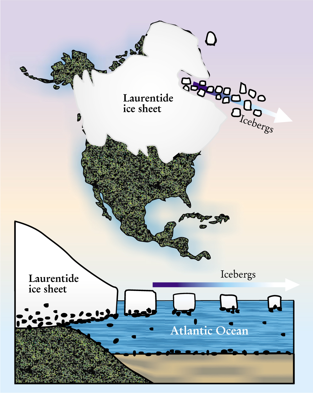 Figure 3. During a Heinrich event, icebergs surge into the North Atlantic Ocean. The lower panel illustrates the entrainment of debris (black) by icebergs and the subsequent sedimentation of the debris in the deep North Atlantic.