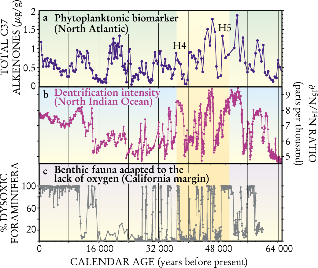 Figure 5. Dansgaard–Oeschger and Heinrich events are reflected in records of the marine carbon cycle during the last 65 000 years. (a) Concentration of 37-carbon alkenones, a phytoplanktonic biomarker in North Atlantic Ocean sediments. We obtained this record at CEREGE on a core sampled off the Iberian Margin. (b) The nitrogen-15/nitrogen-14 ratio in organic matter preserved in North Indian Ocean sediments was measured by Mark Altabet from the University of Massachusetts Dartmouth and his colleagues, and is correlated to the oxygen depletion caused by biological activity in the ocean. (c) Oxygen depletion is also reflected in the relative abundance of benthic foraminifera that have adapted to the lack of dissolved oxygen in marine bottom waters. The record shown was obtained on sediments from the California Margin by Jim Kennett and his collaborators at the University of California, Santa Barbara. The methods used to generate these records are described in the