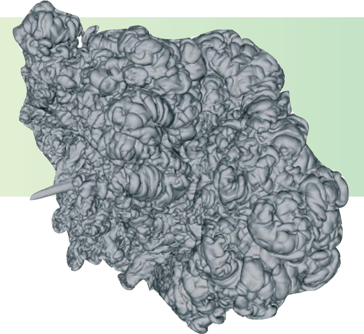 Figure 1. Just before a white dwarf blows up as a type la supernova, the volume inside the turbulent, expanding burn front shown in this simulation of the star’s interior contains hot carbon-oxygen fusion products created in the fraction of a second since ignition at an off-center point near the fingerlike structure at left. Outside the front is the 96% of the star’s C and O still unburnt. A few seconds later, the front may break through the star’s surface and spread over it, giving birth to the supernova. The simulation was done at the University of Chicago’s ASCI Flash Center.
