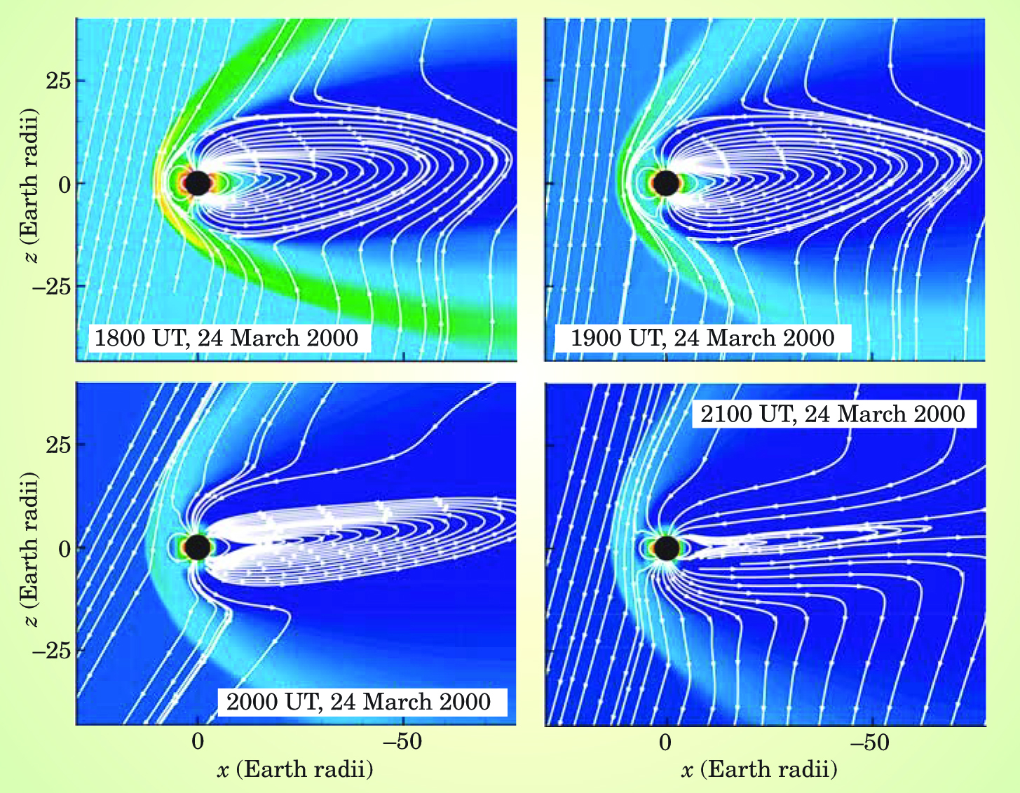 Figure 4. Effect on Earth’s magnetosphere of the arrival of plasma and associated magnetic field from a strong mass ejection off the Sun’s corona three days earlier, simulated by a group at the University of Michigan. Color intensity indicates pressure and the white lines are projections of the magnetic field on the plane that cuts Earth’s noon and midnight meridians. The x axis marks the direction of the Sun, off to the left.