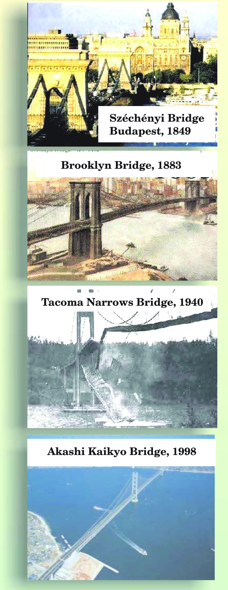 Figure 5. Four suspension bridges illustrate typical stages on the way to maturity for an engineering technology. The two 19th-century bridges, spanning the Danube at Budapest and New York’s East River, are still in service. Lessons learned from the spectacular 1940 collapse of the newly built Tacoma Narrows Bridge in Washington State have contributed to the confident design of ambitious modern structures like the Akashi Kaikyo Bridge built near Kobe in a region of Japan prone to earthquakes. Its central span is 2 km long.