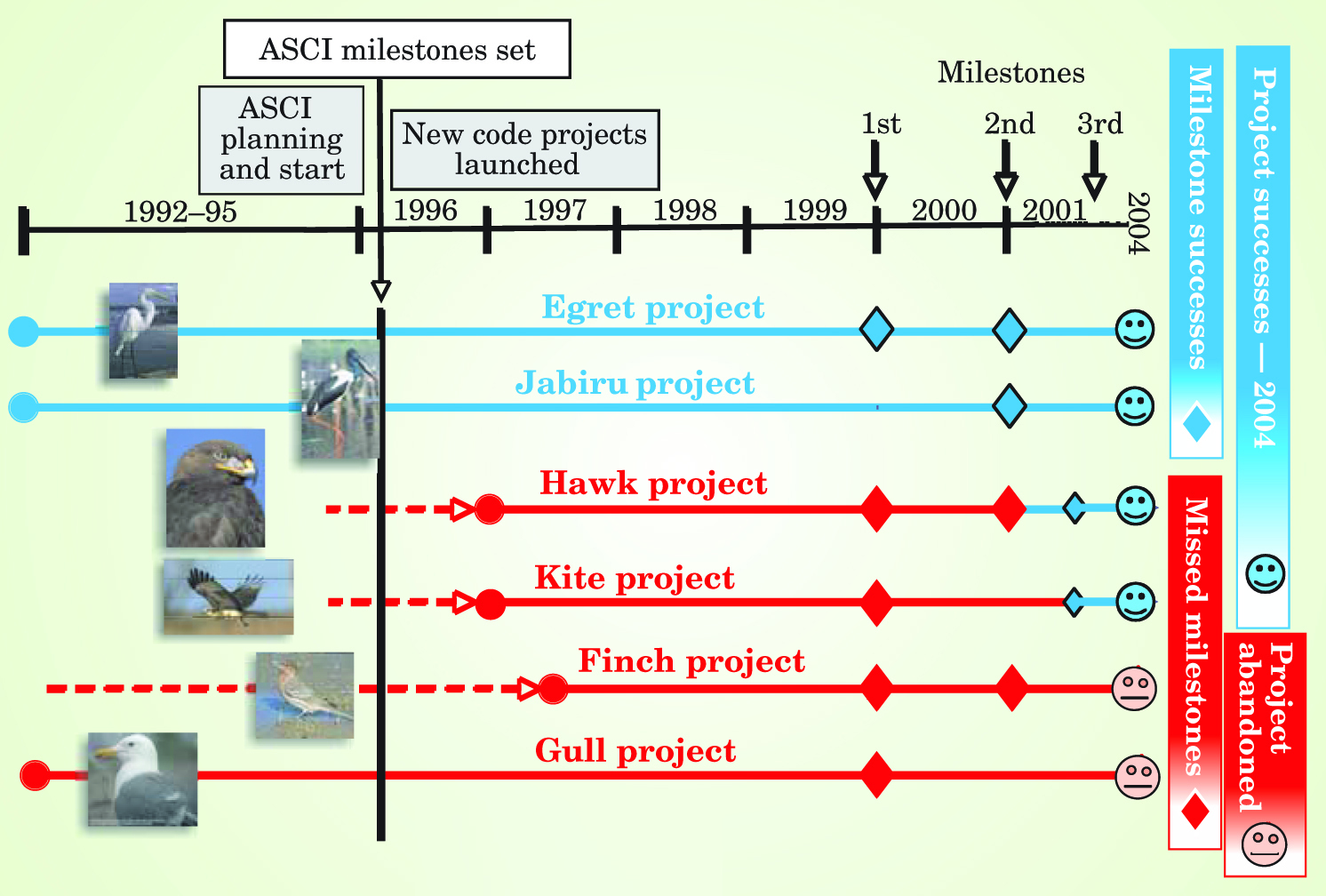 The Egret and Jabiru projects, which met all their milestones, did have full head starts and well-led and strongly supported teams. The Hawk and Kite projects didn’t get started until mid-1996. After they failed to meet their initial milestones, their goals were revised to be more realistic. Now, eight years after they began, they are beginning to succeed.