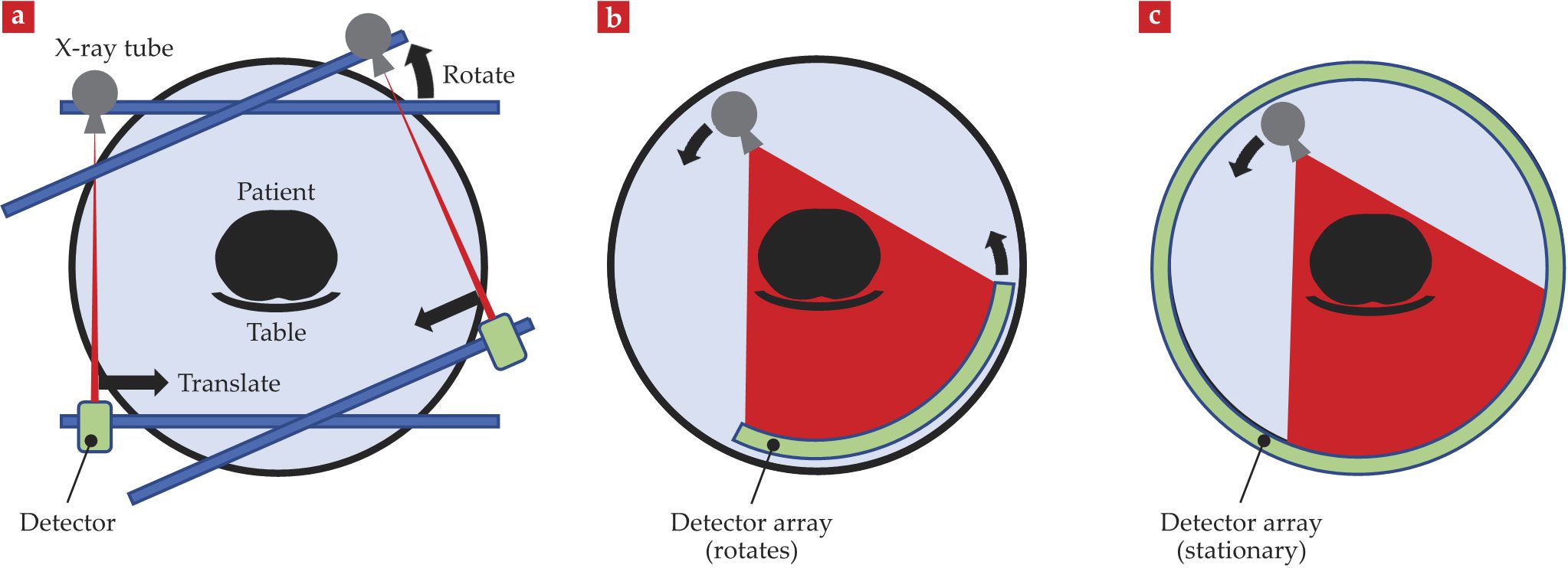 Computed tomography (CT) has evolved considerably since 1971. (a) In the translate–rotate geometry, the x-ray tube and detector were mounted opposite one another, with the patient’s head placed between them. The tube and detector together translated across the width of the patient’s head in one direction, after which the frame on which they were secured rotated by 1°; the tube and detector were then translated back across the patient’s head in the other direction. Those processes were repeated until the device had rotated 180° around the patient. (b) In the rotate–rotate geometry, an array of detectors sits opposite an x-ray tube that emits a fan-shaped beam. Both the tube and the detectors rotate synchronously around the patient to acquire data. Producing significantly shorter scan times, the geometry is used in all commercial CT scanners today. (c) In the rotate–stationary geometry, the detector was a stationary, ring-shaped array and the fan-shaped x-ray beam rotated around the patient within the detector array. The expensive detector array, less dose-efficient geometry, and limited ability to block scattered radiation led to abandonment of this geometry. (Courtesy of John Boone/University of California, Davis.)
