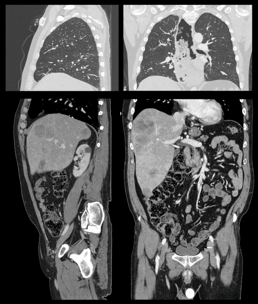 Sagittal and coronal perspectives of the torso. Images of the thorax (top) and abdomen and pelvis (bottom) demonstrate the remarkable clarity with which computed tomography (CT) imaging can depict human anatomy. Excellent contrast between air, tissue, and bone makes CT scans of the lung essential for diagnosing many pulmonary disorders. A vascular contrast agent containing high-atomic-number iodine can be injected to enhance the contrast of soft tissues in the abdomen and pelvis and make blood vessels and cardiac chambers visible. (Courtesy of Canon Medical Systems, USA.)