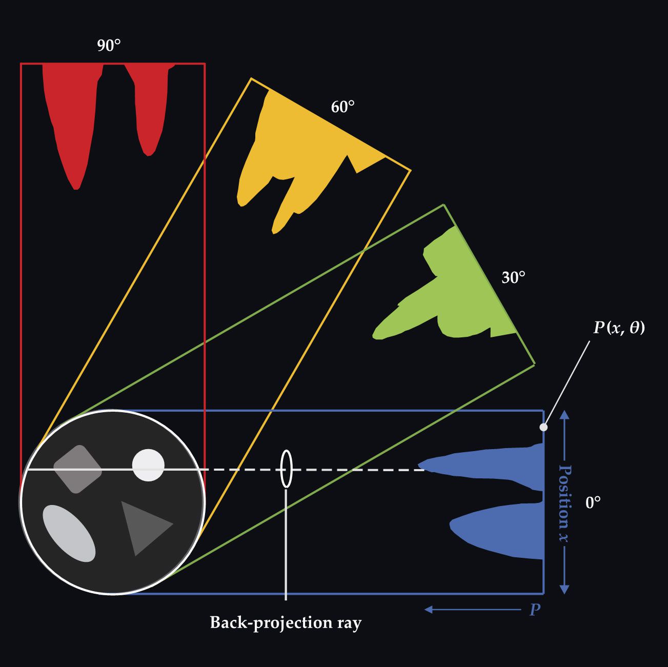 Filtered back-projection reconstruction. These projection data represent the total x-ray attenuation of an object along a path between the x-ray source and detector. To reconstruct the computed tomography (CT) image, the data are back projected along the direction in which they were acquired. The process uniformly distributes the measured attenuation along the line between the x-ray source and detector. The image shows four data sets at four different projection angles