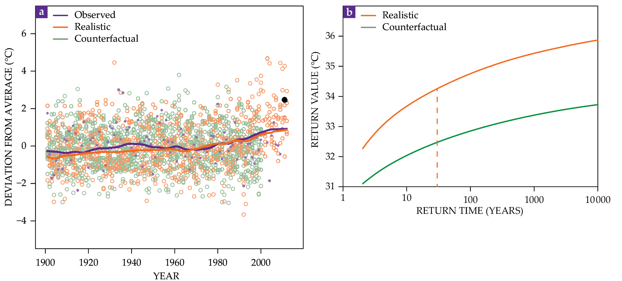 Departure from average summer temperatures in Texas. (a) A realistic historical simulation (orange) and a cooler counterfactual climate without anthropogenic climate change (green) are compared with the observations (purple). The black dot represents the observed value of 2.467 °C for 2011. The solid lines represent the smoothed temperature anomalies. (Adapted from ref.