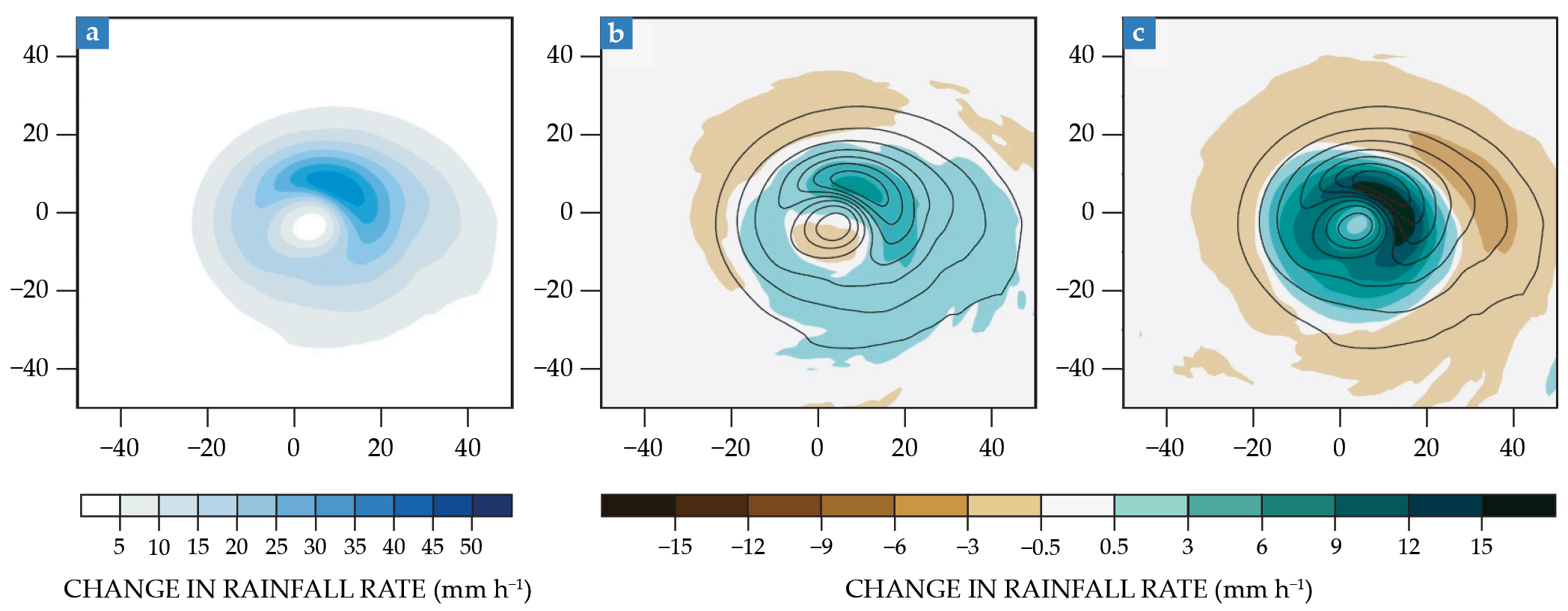 Much progress has recently been made in understanding the human-induced increases in tropical cyclone precipitation through storyline event-attribution analyses. For instance, three independent attribution studies were performed on data from Hurricane Harvey, a stalled tropical cyclone that dumped copious amounts of precipitation on Texas’s greater Houston and Gulf Coast regions in 2017. 8 , 11 , 12 A best estimate distilled from those papers is that climate change increased Harvey’s rainfall by 19%, or about 2.5 times as much as what might be expected from Clausius–Clapeyron scaling of the increased available moisture from the 1 °C of attributable warming in the Gulf of Mexico. Since Harvey, numerous other tropical storms have been analyzed and have revealed similar scaling of precipitation statistics. 10 , 13