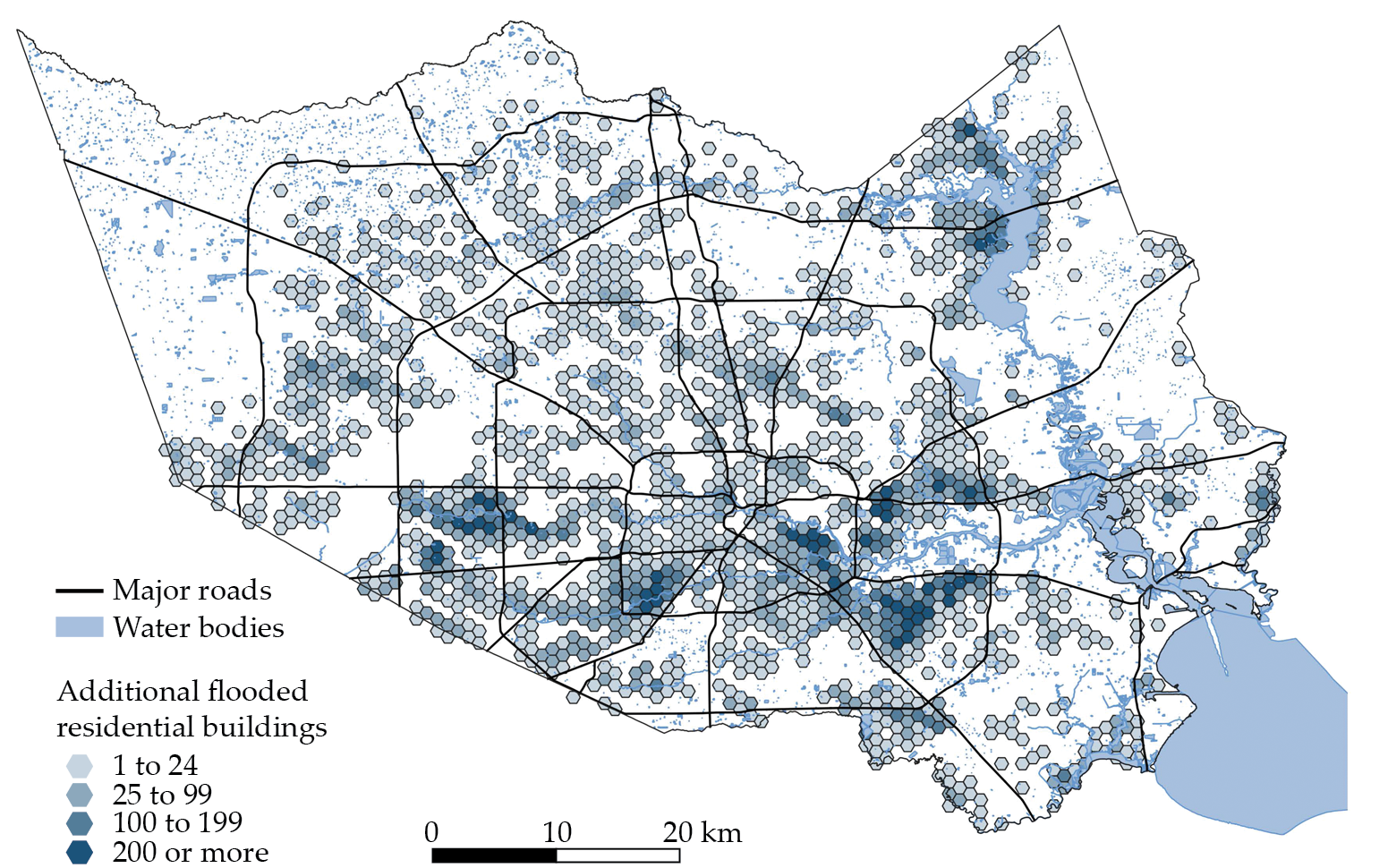 Additional anthropogenic flooding. Each hexagonal bin symbolizes the upper limit of the number of residential buildings that would not have flooded without the added impact of climate change in Harris County, Texas, during Hurricane Harvey in 2017. (Adapted from ref.
