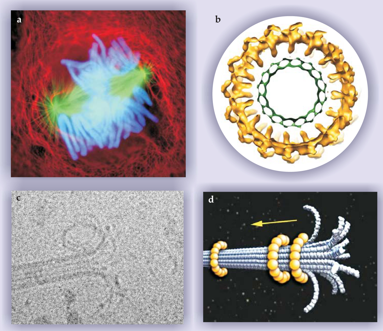 Figure 1. A complex structural system, involving key features at progressively smaller size scales, plays an essential role in the allocation of duplicate copies of the genome to daughter cells during cell division. (a) The mitotic spindle, readily visible in this light-microscope image, contains microtubules (green) that are attached at one end to a “pole” (centriole) and at the other end to one of the chromosomes (blue). Movement of chromosomes to the poles is accompanied by the shortening of the microtubules in the spindle. Keratin filaments, another component of the cytoskeleton, are shown in red. The width of individual chromosomes is about 2 µm. (b) Cryo-electron microscopy is helping to reveal the mechanism by which microtubules might be attached to chromosomes. One component of this attachment apparatus is the Dam1 complex, which Georjana Barnes, David Drubin, and colleagues discovered