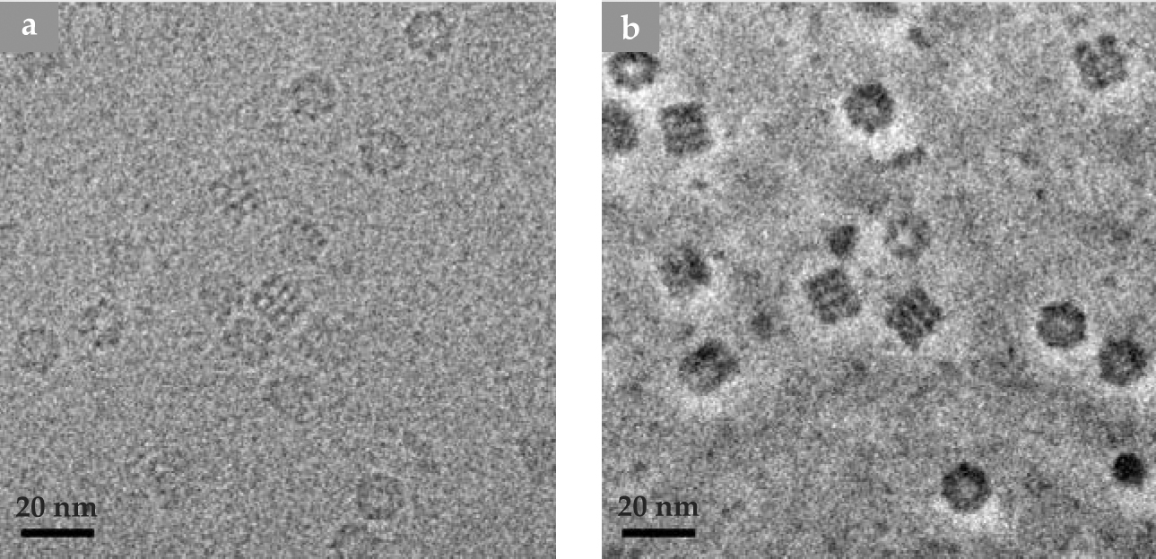 Figure 3. The contrast in cryo-electron microscopy images of biological macromolecules is much greater when a miniature device is used to apply a phase shift of 90° to the electrons that scatter in the sample. Unstained biological specimens alter the phase of the electrons but not the beam intensity. As in light microscopy, some image contrast is produced for such a pure phase object when the image is intentionally defocused. The addition of a phase-shifting quarter-wave plate behind the objective lens produces much greater contrast, however, and it does so without sacrificing high-resolution information, which gets corrupted with intentional defocus. (a) A cryo-EM image, with the objective lens defocused by about 2 µm, of GroEL, an 800-kilodalton protein complex that assists in the proper refolding of misfolded proteins. (b) An in-focus cryo-EM image of GroEL when a thin carbon film is used as a quarter-wave phase plate.