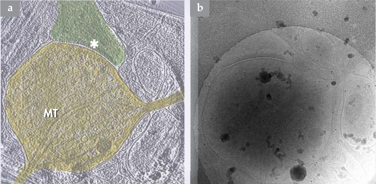 Figure 4. Cryo-EM tomography of whole cells—if they are prepared as suitably thin specimens—solves the problem of the overlap of subcellular features that occurs in single-projection images. Here, tomography has been used to obtain a three-dimensional image of a group of nerve cells. The micro-fabricated hole (large circle in panel b) in the support film on which the neurons have been cultured is 2 µm in diameter. (a) This tomographic slice includes a synapse, which is characterized by a dense molecular apparatus (indicated by an asterisk) on the inner surface of the membrane of the postsynaptic cell (shaded green). Many small vesicles, filled with neurotransmitter molecules, are present in the adjacent, enlarged body of the presynaptic cell (yellow). Microtubules (MT), shown coursing from the right center to the bottom left, fill the axon of the presynaptic neuron, where they serve as “railroad tracks” for motor molecules that carry cargo between the end of the axon and the main cell body. The microtubules likely also serve a structural role. Their walls, roughly 5 nm thick, provide an estimate of the resolution achieved in this tomographic reconstruction. (b) In contrast to a 2D tomographic slice, this 2D projection image of the same cell provides only an indistinct impression of most of the structural features in these cells, and all information is lost about the positions and sizes in the third dimension of those features that can still be identified.