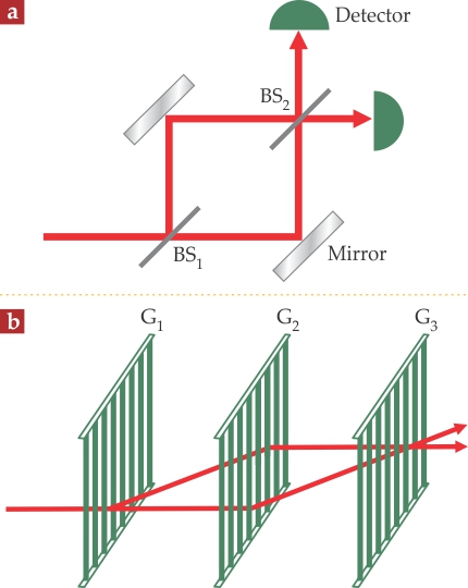 Figure 1. Interferometry’s ingredients. (a) In an optical Mach–Zehnder interferometer, a beamsplitter (BS1) divides an incident beam of light into a superposition of wavelets; mirrors steer the wavelets along two distinct paths toward a second beamsplitter (BS2), and a pair of detectors records the intensity of the superposed wavelet fields. (b) In the matter-wave version of the interferometer, two nanoscale diffraction gratings (G1 and G3) act as the beamsplitters. A third grating (G2) plays the part of the mirrors. The three-grating arrangement has become the basis for many atom and macromolecule interferometers.