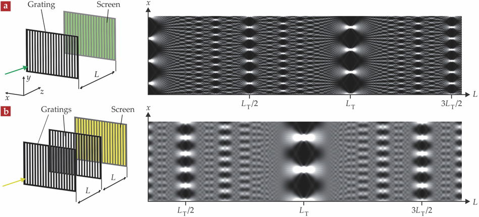 it is based on William Henry Fox Talbot’s observation, nearly two centuries ago, that spatially coherent light can image periodic structures even in the absence of lenses. As shown in figure 3a, coherent light passing through a grating produces self-images of the grating at multiples of the Talbot distance LT = d2/λ. At first glance, that seems to contradict our textbook knowledge that the intensity pattern behind a grating peaks at sinθ = nλ/d. The discrepancy is explained by the fact that Talbot’s observation holds only in the near field behind the grating (z ≪ A2/λ); the textbook equations are given for the far field (z ≫ A2/λ).