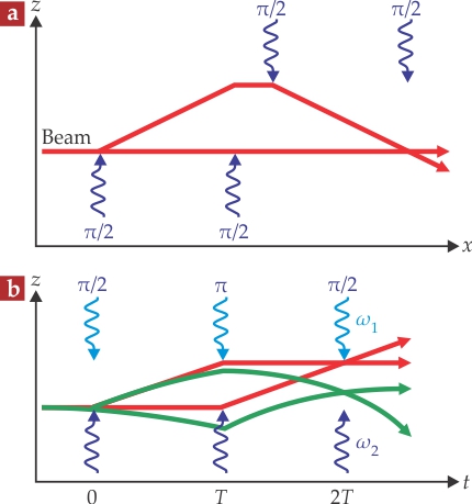 Figure 4. Amplitude beamsplitters. (a) Pulsed laser beams at fixed positions and oriented orthogonal to an atom beam can form what’s known as a Ramsey–Bordé interferometer: A π/2 pulse—which places the beam in a superposition of entangled electronic and momentum states, as depicted in figure 2c—splits the beam into two arms; two successive π/2 pulses steer the arms back together; and a fourth π/2 pulse recombines the arms to produce the interference pattern. (b) An interferometer can also be realized with a three-pulse, π/2-π-π/2 sequence, as shown here for the case in which Raman pulses—counterpropagating beams whose frequency difference, ω2 − ω1, is tuned to a hyperfine transition—are applied to an atomic cloud at intervals of time T. In the presence of gravity, the interferometer can be used to infer the acceleration due to gravity based on the relative phase of the interferometer arms at time 2T. (Red and green paths indicate atom-cloud trajectories in the absence and in the presence of gravity, respectively.)