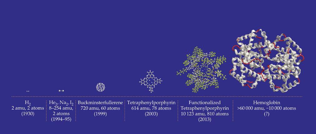 Figure 5. Matter-wave diffraction started in 1930 with diatomic particles, but it didn’t gain momentum until the early 1990s. Since then the technique has been extended to progressively larger and more complex molecules; some are depicted here along with their mass in atomic mass units, the number of atoms they comprise, and the year they were first successfully used in interference experiments. To date, a functionalized tetraphenylporphyrin, synthesized by Marcel Mayor and colleagues, is the most massive object for which matter-wave interference has been seen. In the future, bionanomatter such as hemoglobin proteins will likely be studied using matter-wave-enhanced measurements.