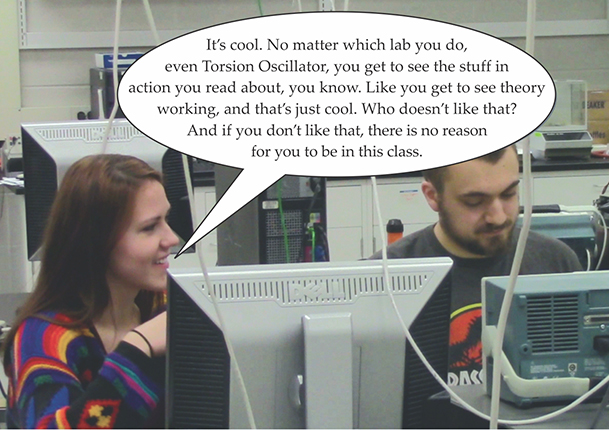 Figure 3. In the advanced laboratory class, Sally and Jacob (played by actors) talk about which experiment they want to do next. Sally wonders why anyone wouldn’t want to do all of the possible experiments.