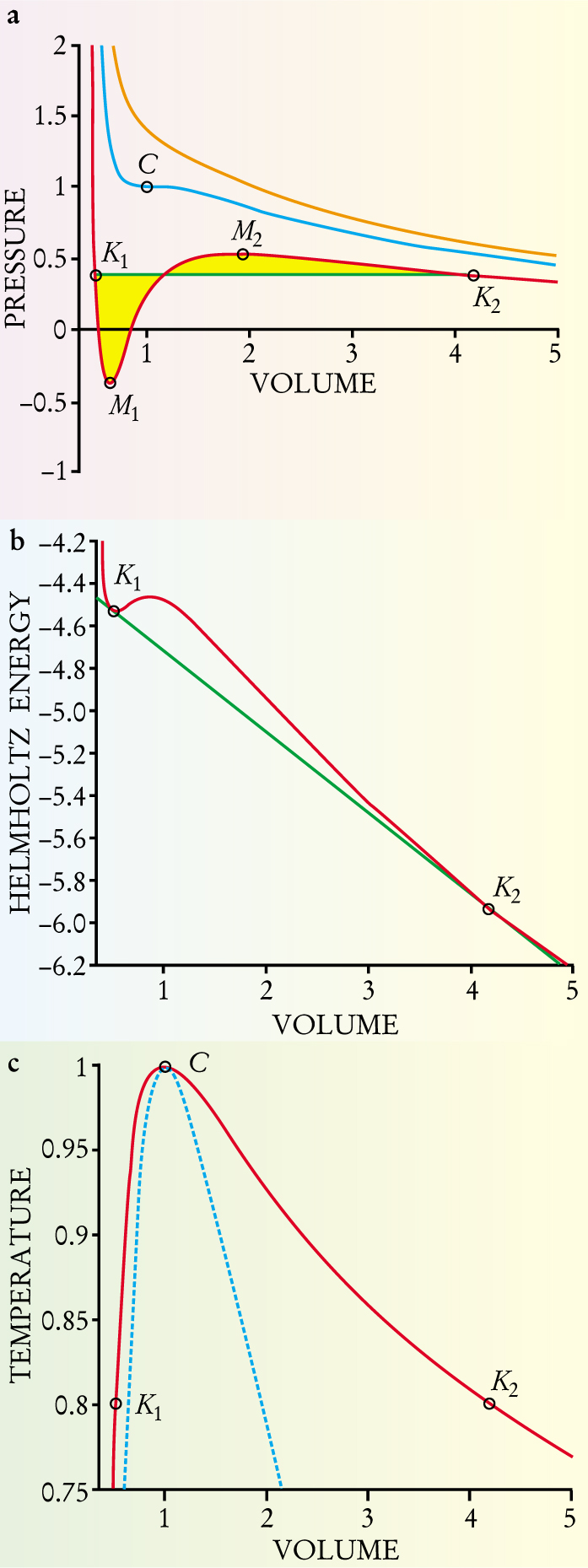 Figure 2. Thermodynamic variables for a one-component system are related by the van der Waals equation of state. (a) The relation between pressure and volume is shown along isotherms, curves of constant temperature. Pressure and volume coordinates are normalized so that the critical point C lies at (1,1). The P–V isotherm at the critical temperature (blue) has a horizontal inflection point at C, where the compressibility is infinite. The compressibility along an isotherm above the critical temperature (orange) is always finite. An isotherm below the critical temperature (red) develops a so-called van der Waals loop between the connodes K 1 and K 2. James Clerk Maxwell proved that the areas (yellow) defined by the loop and the green tie line that connects the connodes must be equal. The connecting tie line describes two-phase states of the system. The minimum (M 1) and maximum (M 2) of the subcritical isotherm are points of infinite compressibility; they are called spinodal points. Between the spinodal points, the compressibility is negative, which thermodynamics forbids. (b) The Helmholtz energy along a subcritical isotherm displays two connodes connected by a doubly tangent tie line. When the volume of the system is between the values defined by the connodes, the system can lower its free energy by following the tie line and splitting into two phases, one liquid, one vapor. The doubly tangent nature of the tie line, like Maxwell’s equal-area rule, guarantees that the two phases are in equilibrium. (c) The coexistence curve, or connodal (solid curve), connects the connodes at all temperatures. At a given subcritical temperature, a dense liquid (at K 1) coexists with a vapor (at K 2). As the temperature increases, the molar volumes of vapor and liquid approach each other. They become equal at the critical point, above which there is no longer a liquid–vapor phase transition. The dashed curve is the spinodal, the locus of extremal points as detailed in (a). It bounds a region that is thermodynamically unstable.