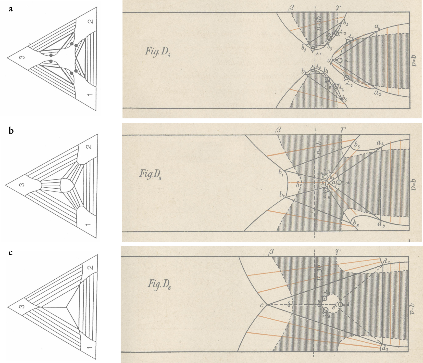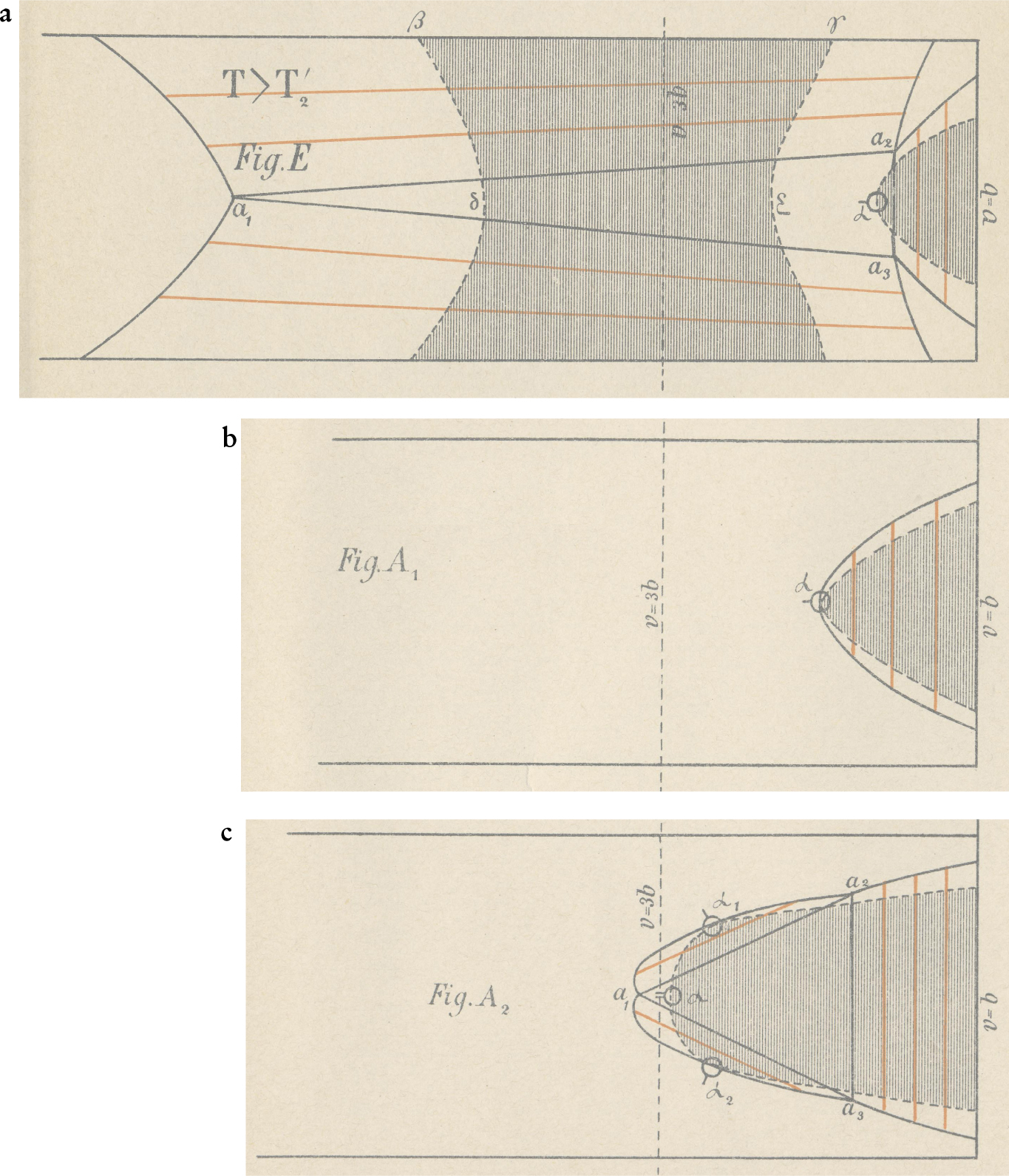 Figure 4. Phase separation of a symmetric van der Waals mixture, as drawn by Diederik Korteweg. Korteweg warned his readers that many features of the diagrams, in particular the connodals, are only qualitative. In all the diagrams, the temperature is fixed, the vertical component is the mole fraction X, and the horizontal coordinate is the volume (called v by Korteweg). The volume axis runs from the close-packed volume (V = b) on the right to larger volumes on the left. The line V = 3b indicates the critical volume of the pure components. The three plots are for different values of the interaction parameter κ, which runs from just below unity (case E) to near zero (case A). Case A2 is for lower temperature than A1. Regions where the surface has positive curvature are blank; those where it has negative curvature are shaded. Dashed curves are spinodals, solid curves are connodals. Red line segments are tie lines, and triangles represent three-phase coexistence. (a) κ is almost 1. Below the critical temperature of the two components, a transverse fold separates vapor and liquid. At a much lower temperature, a longitudinal fold appears, separating two liquid phases. As the longitudinal fold cuts the connodal of the transverse fold, a three-phase region, indicated by the triangle a 1, a 2, a 3, is formed. (b) κ is near 0. The temperature is above the critical temperature of the two components, and there is no phase separation near X = 0 and X = 1. Nevertheless, there is phase separation at small volumes, and a longitudinal fold is present. (c) κ as in (b). The temperature is below that in (b), but still above the critical temperature of the components. The longitudinal fold has split at the top and developed two accessory folds that move to the sides with falling temperature, and finally produce a complete transverse vapor–liquid fold.