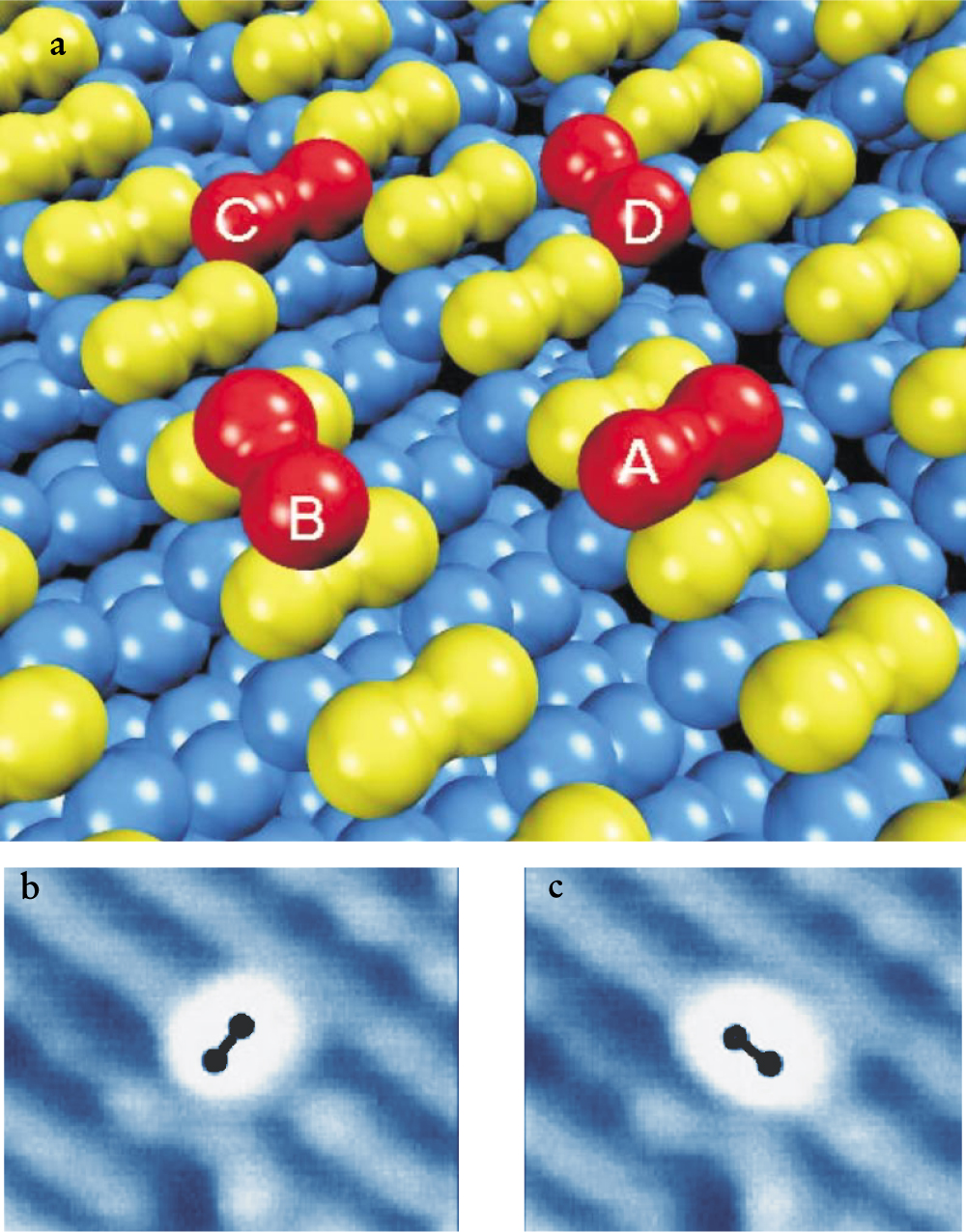 Figure 2. Bound configurations for silicon dimers on a Si(001) substrate. (a) Schematic in which blue balls represent the bulk atoms, yellow dumbbells represent the substrate dimers and red dumbbells represent the adsorbed dimers. The lower images show an adsorbed dimer (b) in the A state and (c) in the B state. Superimposed on these scanning tunneling microscope images are black dumbbells showing the position and orientation of the adsorbed dimer. The area pictured in the STM images is 4 × 3 nm.