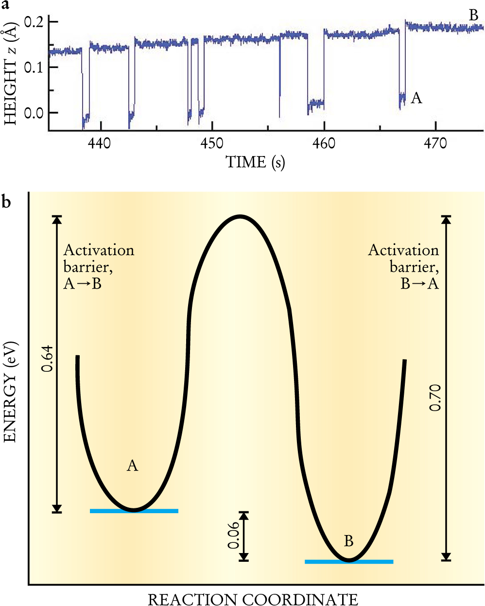 Figure 3. Transitions between A and B states. (a) The measured height, z, of a scanning tunneling microscope tip above an isolated dimer on a silicon surface as a function of time, showing the transitions between the A and B states. The dimer has a higher probability of being found in state B, a consequence of that configuration’s lower bound-state energy. The different transition rates implied for the two states are reflected in their residence times, the periods spent in the given state before making a transition. The dimer has a much greater residence time in state B than in state A. The upward slope of the graph is an experimental artifact and reflects the fact that absolute heights cannot be reliably measured. Relative height differences between the A and B states, however, can be measured accurately. (b) Potential energy surface connecting the A and B states. The reaction coordinate can be interpreted as the angle of the adsorbed dimer bond with respect to the substrate rows. Measurements such as those in (a), made as a function of temperature, yield the activation barriers.7 Occupation-probability measurements yield the bound-state energy separation.6 Consistent with the principle of detailed balance, the difference in activation barriers equals the difference in bound-state energies.