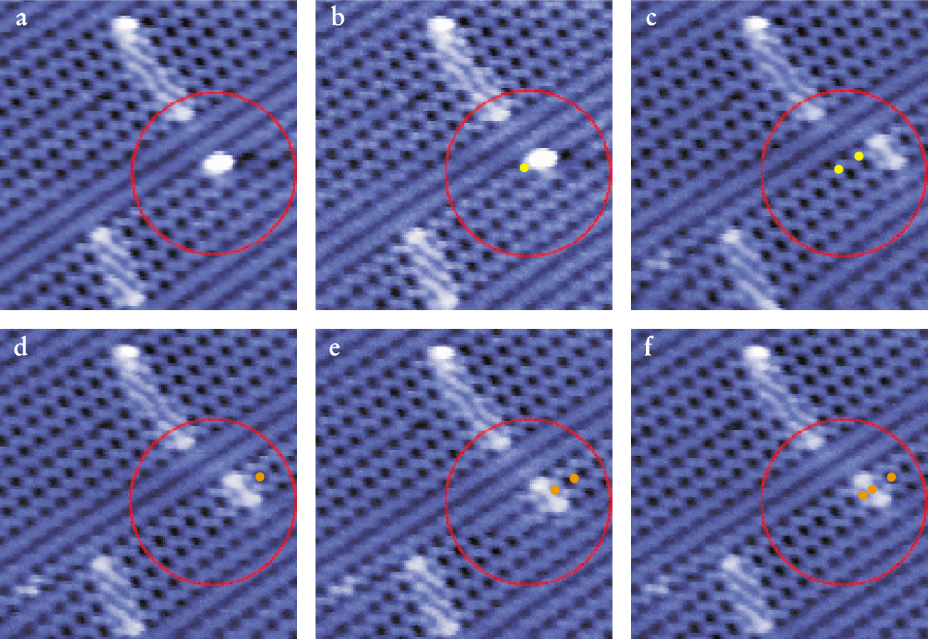 Figure 4. Dimer diffusion in germanium. The images are a series of room-temperature scanning tunneling microscope scans of a 10 × 10-nm segment of a Ge(001) surface on which about 1% of a germanium monolayer was deposited. The time lapse between images is 276 seconds. The yellow and orange marks indicate the previous positions visited by the dimer. Initially the dimer was in the most-stable B configuration and diffused over one of the Ge substrate rows. By the time image (c) was taken, the dimer was in the C configuration, having rotated by 90° and hopped to a trough position between two substrate rows. In this image, some of the substrate rows in the vicinity of the diffusing dimer appear as dots of varying intensity—related to a buckling of the surface dimers in which one surface dimer atom is displaced out of the surface while the other is displaced inward. The specific pattern imaged in (c) indicates that neighboring dimers in the same row tend to buckle in opposite senses. As the dimer diffuses in the trough, its local environment changes significantly. Atoms originally displaced out of the surface become displaced inward and vice versa. In images (d), (e), and (f) these changes are manifested as a fading and reintensification of the buckling registry of the substrate rows in the vicinity of the diffusing dimer.