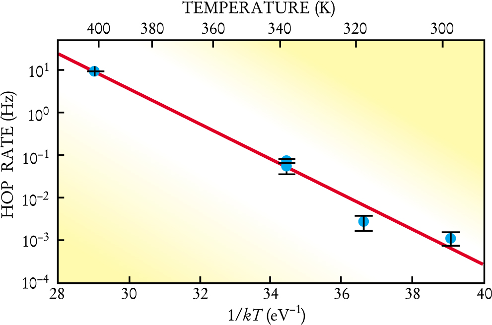 Alikely source of at least some of the disagreement is the difficulty in measuring temperature, particularly in the range from slightly above room temperature to 470 K. A temperature uncertainty of ±25 K would explain the measured discrepancies in hop rates cited in refs. and . Fortunately, temperature uncertainties have a very small effect on relative energies, such as the difference in bound-state energies between two sites measured at a constant temperature. The greatest contributor to uncertainties in the measurement of relative energies is the standard root-N error of statistical measurements. With easily acquired data sets of several hundred measurements, uncertainties as small as 5 meV can be achieved.