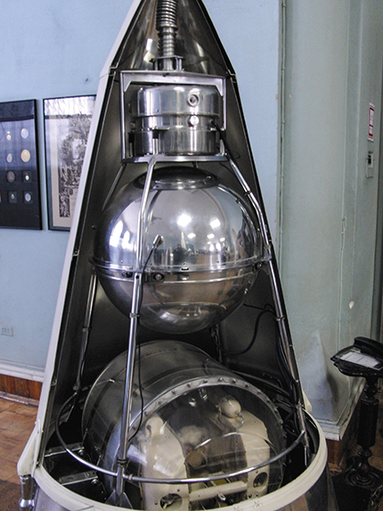 The year 2017 marks the 60th anniversary of the dawn of the space age. On 4 October 1957, our planet’s first artificial satellite, Sputnik 1 (Russian for “companion”), was launched into low-Earth orbit by the Soviet Union. Although little more than a radio beacon, it showed the world that intercontinental ballistic missiles (ICBMs), at the core of Cold War military arsenals, could also place satellites into space. A mere month later, on 3 November, Soviet scientists launched a much larger and more sophisticated spacecraft—Sputnik 2, the second satellite sent into orbit and the first with a live animal; a model with a doll stand-in is pictured in figure