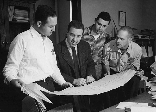 James Van Allen (1914–2006; center, in the dark suit) is surrounded by his team—graduate students Carl McIlwain (left) and George Ludwig (right) and assistant professor Ernie Ray (far right). They are looking over particle flux data detected by the team’s Geiger counter aboard the Explorer 1 satellite. (Courtesy of the James A. Van Allen Papers, University of Iowa Libraries.)
