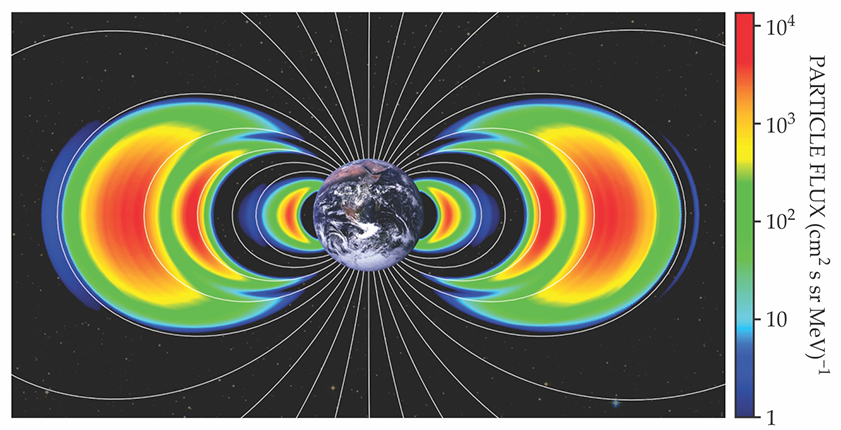 Once accelerated, the electrons were found to circle Earth for weeks or months on magnetic drift paths without significant loss of energy or intensity, only to be abruptly lost when a shock wave from another powerful CME hit Earth and sufficiently distorted the magnetosphere. In the figure, which illustrates the flux of 4.2 MeV particles in cross section, the third Van Allen belt appears sandwiched between the inner belt’s population of mostly protons and the outer belt’s population of mostly electrons.