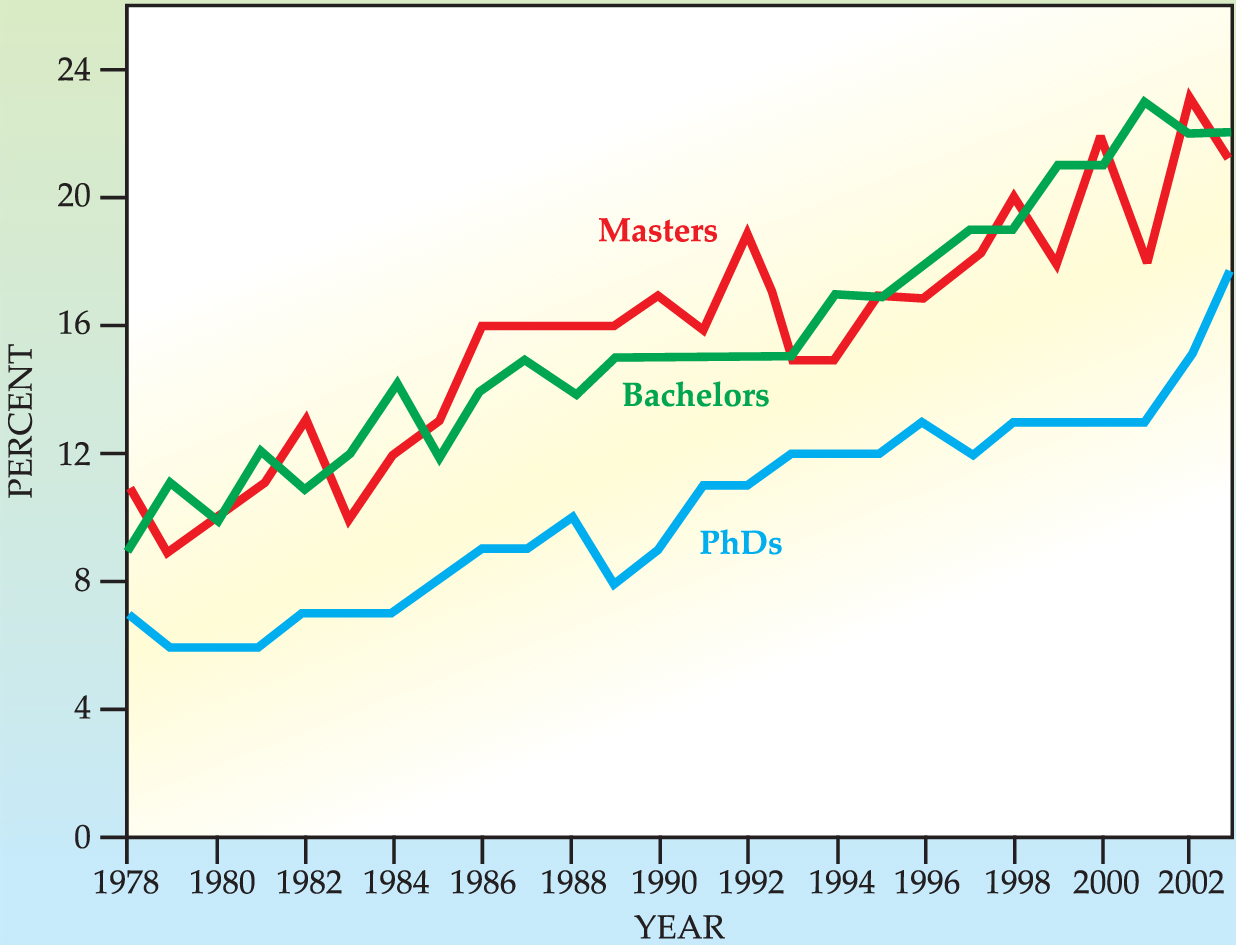 Figure 1. Women received an increasing percentage of the physics degrees from US colleges and universities from 1978 to 2003. Still, in 2003, women received far less than one-fourth of the bachelor’s, master’s, and PhD degrees conferred in the US.