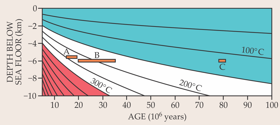 Figure 1. Oceanic crust forms at the mid-ocean ridge and slowly cools as it ages and moves away from the ridge. A simple thermal diffusion model predicts the temperature of the crust and upper mantle as a function of age and depth below the sea floor. Applying appropriate boundary conditions—a thermal diffusivity of 6 × 10−7 m2 s−1, an initial mantle melting temperature of 1340 °C, and a sea-floor temperature of 0 °C—yields the isotherms shown in the plot. The orange bars indicate the approximate temperature at each of the prospective drilling regions—A (the Cocos plate), B (off Baja, California), and C (off Hawaii), discussed in box