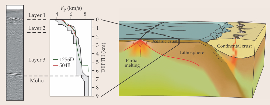 Figure 2. When a seismic wave encounters an interface between materials with different acoustic impedances, some of the wave’s energy is reflected. At left, a seismic reflection image shows the layered structure of crust beneath the Pacific Ocean. At its right are compression-wave velocity profiles Vp of the seismic waves propagating through the layers, with zero depth referenced to the bottom of the first, sedimentary layer. The sharp, strong reflection below the third layer marks the Mohorovičić discontinuity, or Moho, the boundary between Earth’s crust and its lithosphere, or upper mantle. In the plot, the gray region outlines the range of seismic velocity profiles measured through 29-million-year-old crust of partially melted mantle rock extruded from Earth’s mid-ocean ridge. The green and red profiles are the estimated wave velocities around holes at drilling sites 1256 (described in box