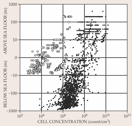 Figure 3. Microbial cells, whose number is determined by fluorescent imaging, decrease in concentration with depth in sea-floor sediment. Open circles represent cells found below the South Pacific Gyre, where cell numbers are very low even at the sea-floor surface thanks to the nutrient-poor nature of the gyre. Open triangles represent cells found at the edges of the gyre, where more organic-compound-enriched sediments exist on the sea floor; filled circles represent cells found in sediments elsewhere on the Pacific sea floor. The cellular concentration decreases roughly linearly to very low levels—about a factor of 10 or more for each order of magnitude increase in depth below the sediment surface. (Adapted from ref.