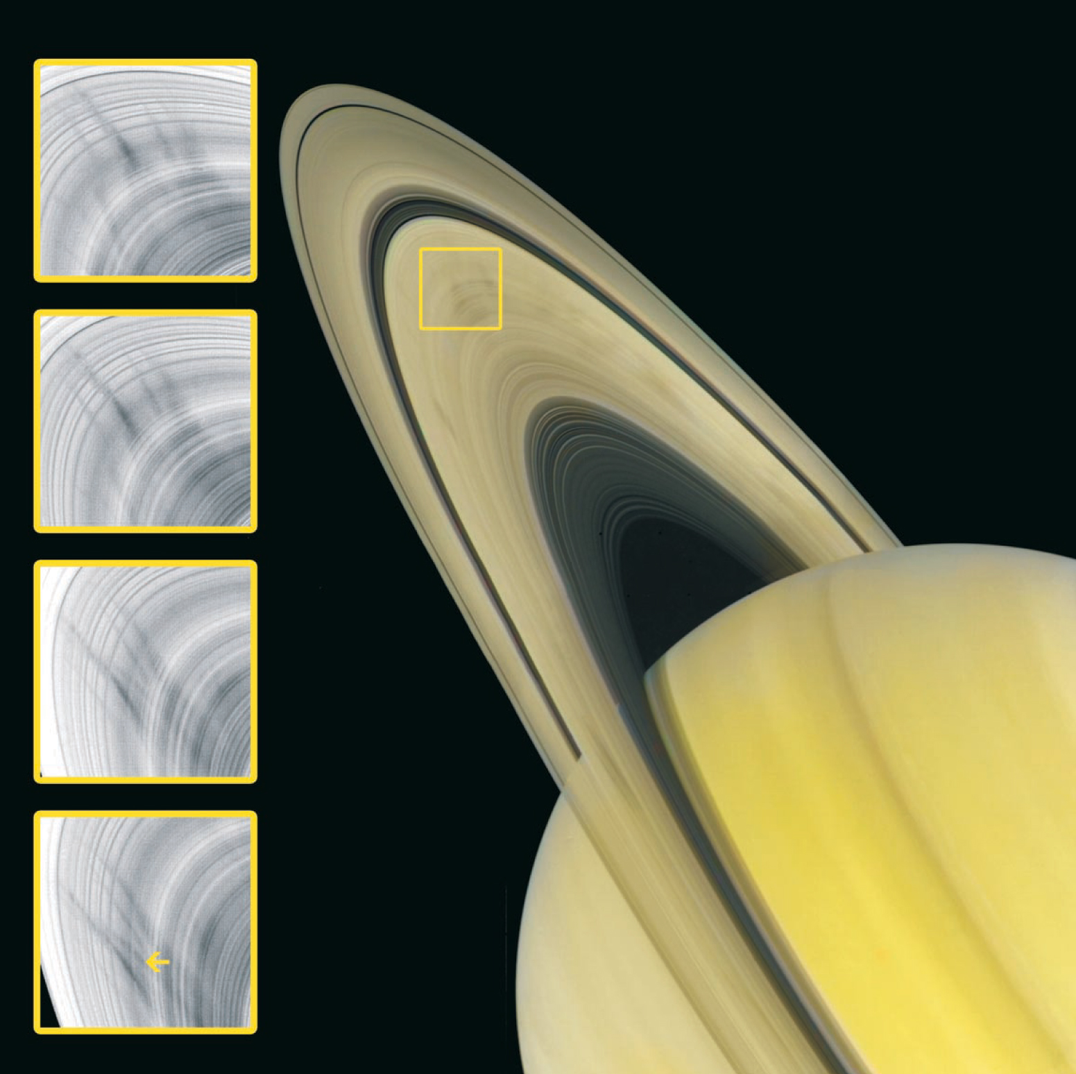 Figure 1. Dynamic spokes in Saturn’s B ring, the wide bright ring just inside the prominent dark Cassini ring. The square fields at left are successive detailed images of the same orbiting physical region (yellow square), taken at roughly 10-minute intervals by Voyager 2 in 1981. The observed pattern of nearly radial “spokes,” appearing dark against a bright background as the spacecraft approaches from the Sun side, changes quite rapidly. New spokes form in as little as five minutes, which suggests that the fine dust particles that compose them are affected by electromagnetic fields.