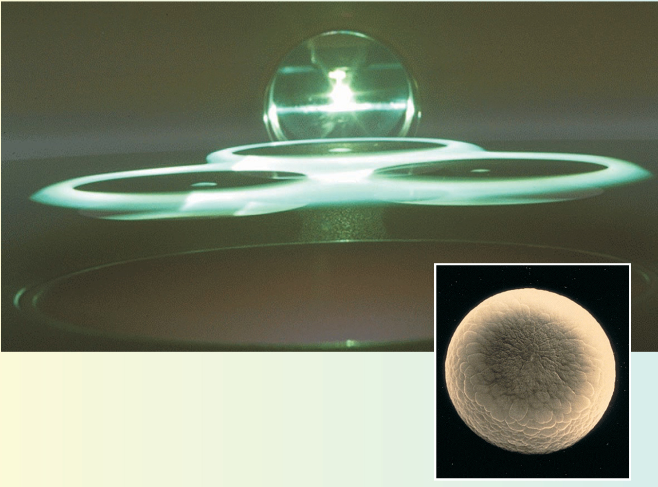 Figure 2. Rings of dust particles encircling silicon wafers in a plasma processing device. In an accidental 1989 discovery, laser light was shone into a plasma used to etch Si wafers so that the expected weak optical fluorescence would monitor concentrations of reactive gas. Instead, the fluorescence was overwhelmed by scattering of the incident light off unanticipated clouds of micron-sized particles electrically suspended in the plasma above the wafers.4 Although great pains had been taken to minimize dust contamination of the clean room, it was discovered that the particles actually formed and grew in the plasma. When the RF power that generates the plasma is turned off, the particles fall onto the wafer, contaminating it. (Inset) An electron-microscope image of a 20-µm-diameter particle from such a dust cloud.