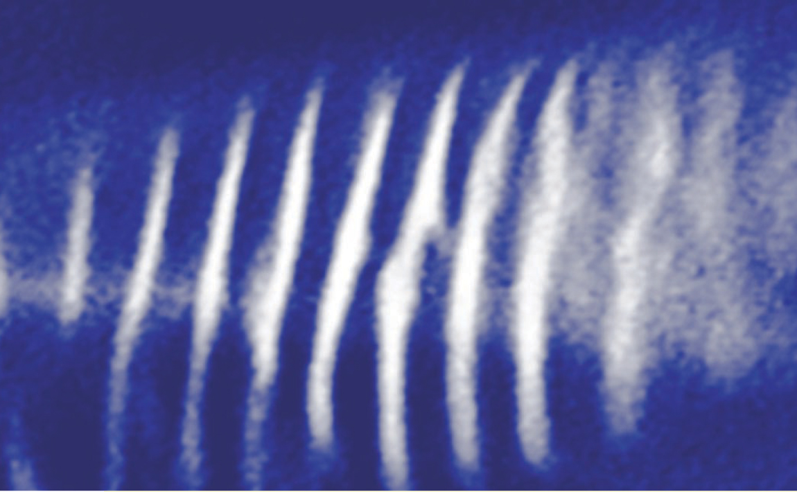 Figure 3. A dust acoustic wave propagating in a plasma shows up in a video image of light scattered by dust clouds in the plasma. The bright bands are compression wavefronts. Ordinary plasma waves in dustless plasmas cannot be visually imaged in this way. The wave is essentially a sound wave in the charged dust component of the plasma. Because the wave propagation involves the dynamics of the heavy dust particles with small charge-to-mass ratios, it’s very slow (a few centimeters per second) and its frequency is only on the order of a hertz. By contrast, ion-acoustic waves in the plasma travel at kilometers per second.