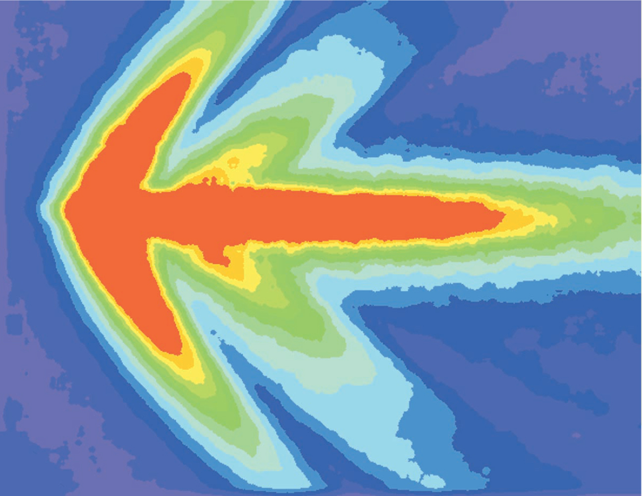 Figure 4. A Mach cone formed in a laboratory dusty plasma by suddenly pushing plastic microparticles in a suspended monolayer toward the left by means of an intense, movable laser beam in a setup like that depicted in box 2. The disturbed particles are illuminated by another, less intense laser and imaged with a video camera. False colors indicate resulting microparticle speeds in different regions of the monolayer. Red is fastest, blue slowest. The clearly observed Mach cone is a superposition of supersonic wakes generated by particles moving faster than the slow acoustic speed of the plasma’s dust component, in which Coulomb repulsion, rather than collision, is the mechanism of acoustic propagation. The red region is about 2 cm long, and the displayed field comprises about 104 microparticles.