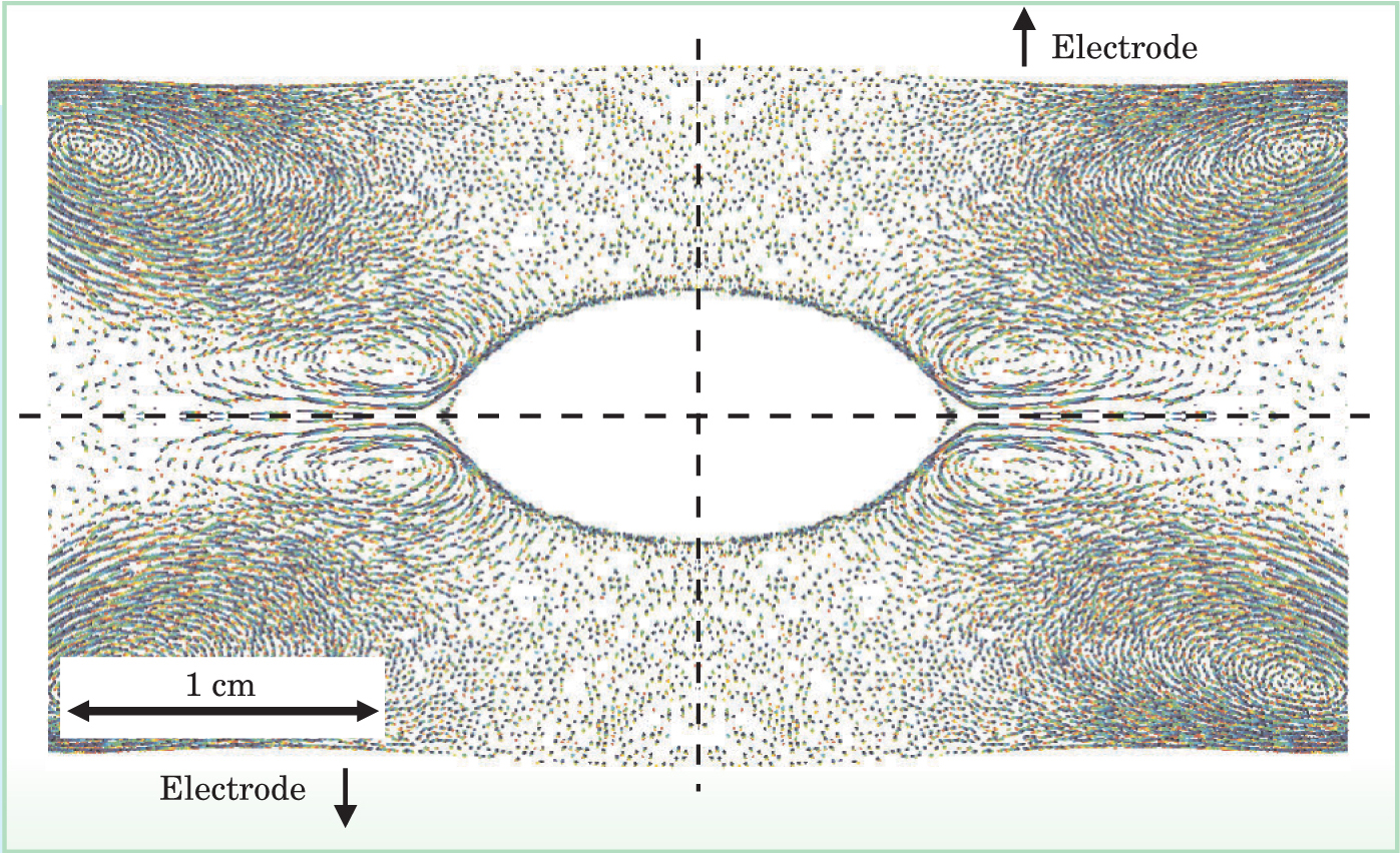 The experiment is a German–Russian collaboration. The plasma chamber, built in Germany for the space station, has been named the Nefedov Plasma Crystal Experiment in honor of Anatoli Nefedov, a leader of the Russian contingent who died in 2001. The apparatus, similar to the one shown in box 2, is about the size of a microwave oven. A video image of one of the dust structures (figure 5) shows a variety of features, including a sharply defined void in the center, a stable crystal-like array below the void, and fluid vortices along the horizontal axis and outer edges.
