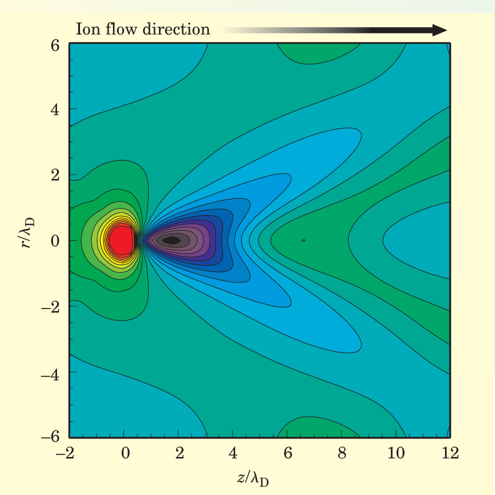 Nonetheless, so-called particle-in-cell (PIC) methods are being successfully applied to dusty plasmas. The methods can handle the inclusion of realistic complications such as ion–dust collisions and nonspherical particle shapes. Figure 6 shows the result of a PIC calculation, by Martin Lampe and colleagues at the Naval Research Laboratory in Washington, DC, of the three-dimensional potential around a negatively charged dust grain immersed in a plasma with flowing ions.