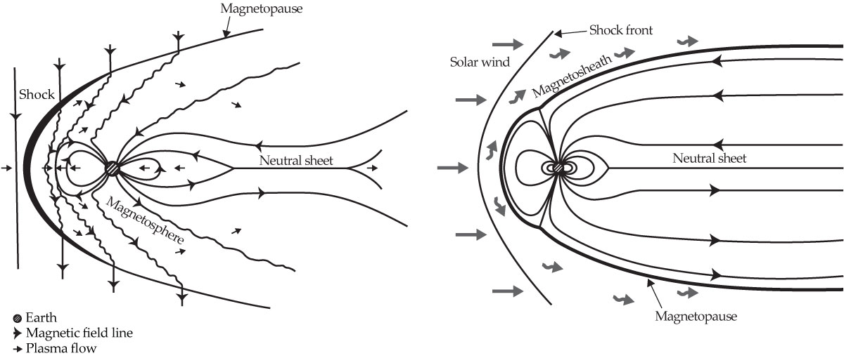 Schematic renderings of the open (left) and closed (right) models of Earth’s magnetosphere developed, respectively, by James Dungey and Alexander Dessler. (Images courtesy of GreenPepper Media.)