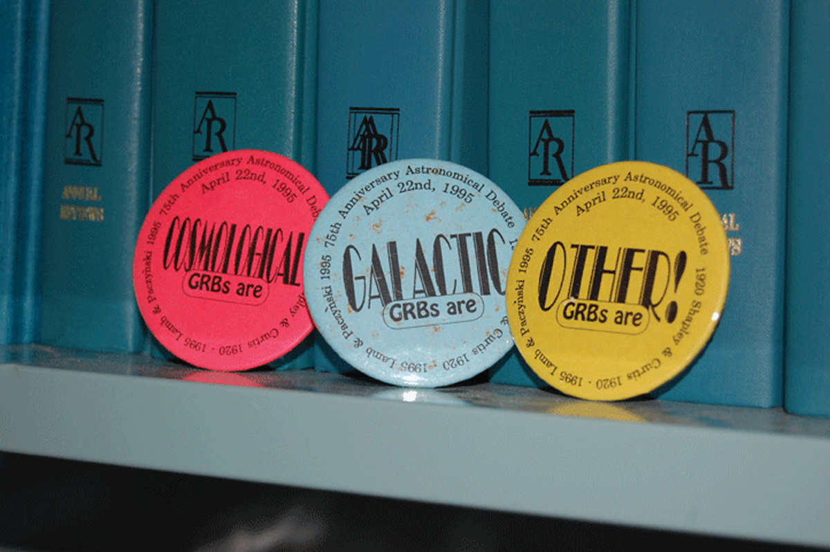 Buttons worn by attendees at the 22 April 1995 debate between Bohdan Paczyński and Donald Lamb about the origins of gamma-ray bursts. Those who believed that the bursts come from beyond our galaxy wore the red buttons; those who believed that they occur in our galaxy wore the blue ones. (Photo by Pflatau/Wikimedia Commons/CC BY-SA 3.0