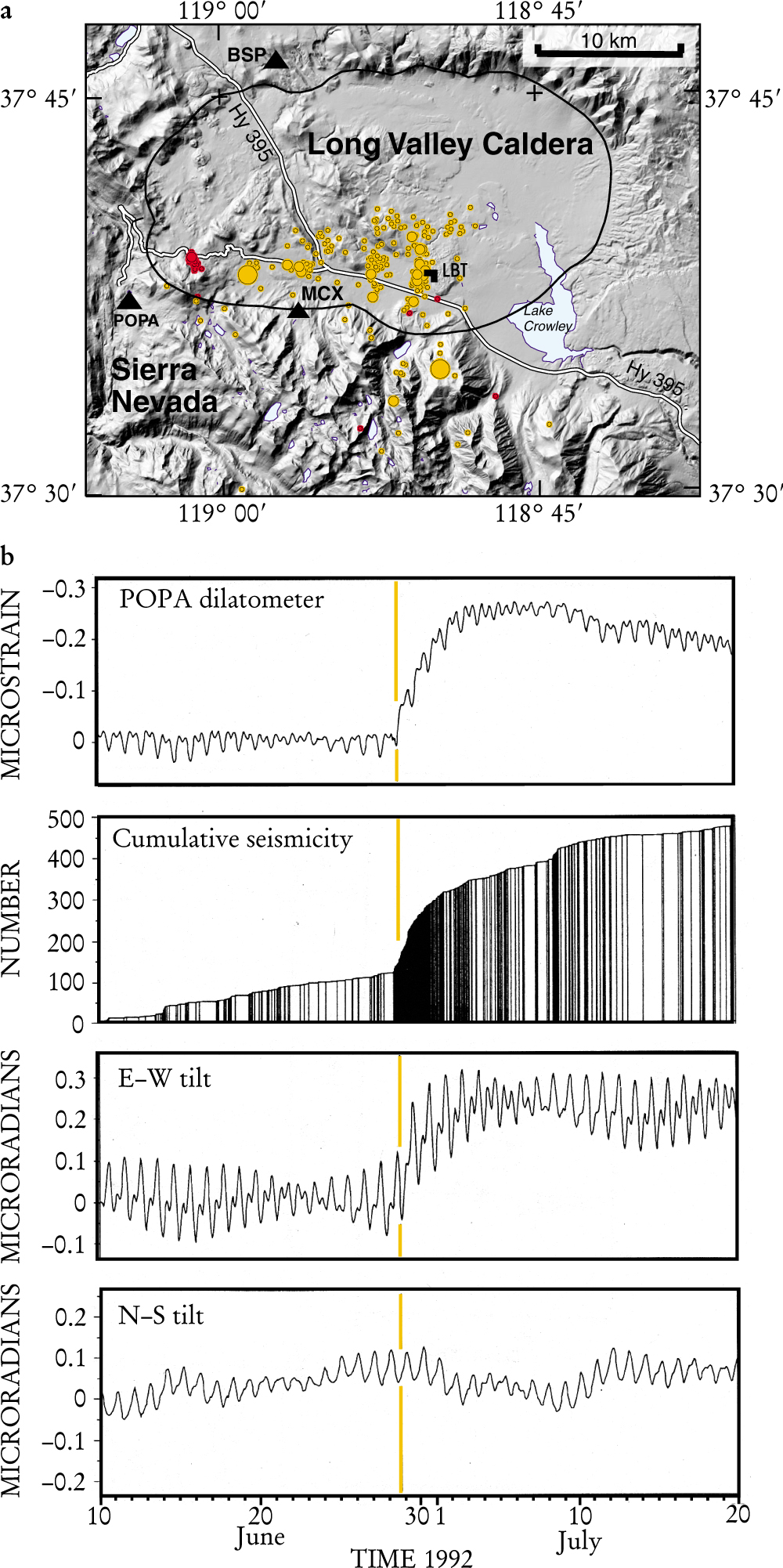 Figure 2. Seismicity and volcanic unrest were triggered in Long Valley caldera in eastern California by the magnitude-7.3 Landers earthquake of 28 June 19924 and the magnitude-7.1 Hector Mine earthquake of 16 October 1999.11(a) Earthquakes triggered by the Landers and Hector Mine earthquakes are indicated by orange and red circles, respectively, whose sizes scale with increasing magnitude from 1 to 3. Borehole dilatometers that measure volumetric strain in the crust are indicated by the solid triangles and the long-base tiltmeter (LBT) by the inverted L. (b) Time histories from 10 June to 20 July 1992 show the volumetric strain recorded by the POPA dilatometer, cumulative number of earthquakes, and the east-west and north–south components of the LBT. Negative strain is compressional; positive tilt is down to the east and north. The high-frequency wiggles on the dilatometer and tiltmeter records are solid-earth tides. The time of the Landers earthquake is marked by the orange line. Similar but somewhat smaller effects were seen after the Hector Mine earthquake.