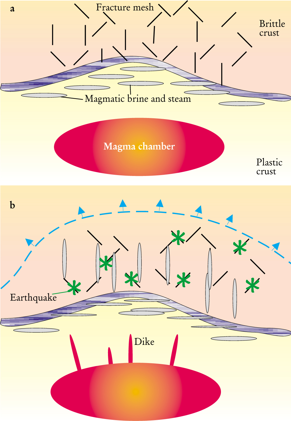 Figure 3. Hydraulic surges are the basis of one model for dynamic triggering. (a) This cross section through the base of a hypothetical geothermal system shows the brittle crust (orange) and the underlying plastic crust (yellow). Hydrothermal fluids circulate by thermal convection through a fracture mesh in the brittle crust; the fracture permeability is maintained by recurring earthquakes. The hydrothermal system is heated from below by conductive heat flow across the impermeable, brittle–plastic transition zone (purple). The transition from brittle to plastic deformation coincides with the 350–400°C isotherm in silica-containing rocks. Below this transition zone, rocks deform plastically, which reduces the permeability effectively to zero. Volatile magmatic fluids released by the underlying magma chamber (red) are trapped in isolated pods (gray) under high pressure. (b) Large dynamic strains accompanying the seismic waves from a distant earthquake disrupt the brittle–plastic transition, allowing fluids within this zone access to the fracture mesh in the overlying brittle crust. The resulting pressure surge (blue) propagates through the fracture mesh, triggering earthquakes (green) and deforming the brittle crust in an episode of volcanic unrest.