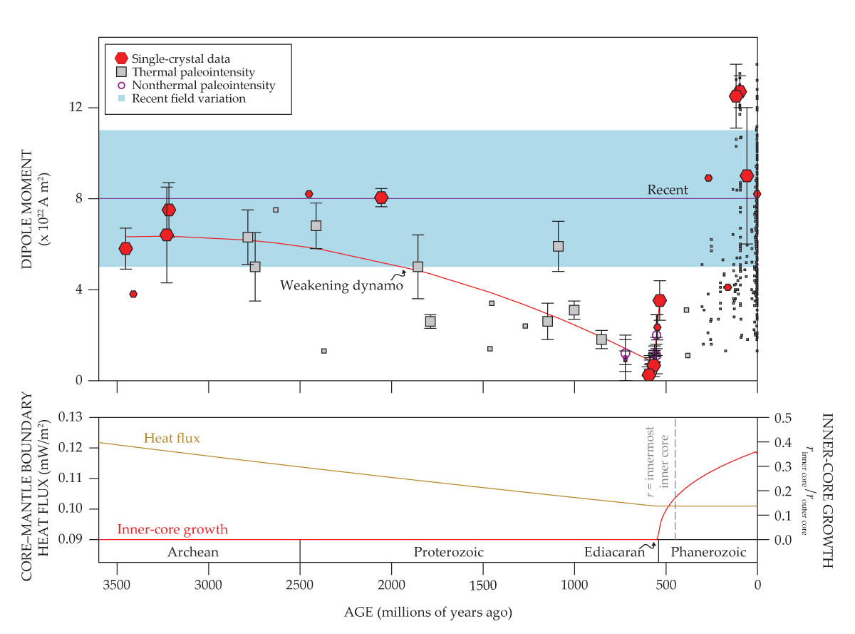 Models predict that the magnetic field would strengthen as soon as the inner core started to grow because energy from both latent heat of crystallization and composition buoyancy would supply new power to the dynamo. Seizing on that prediction, Tinghong Zhou and colleagues conducted single-crystal paleointensity analyses on slowly cooled igneous rocks of the earliest Cambrian Period, just after the Ediacaran Period. They found that the time-averaged field strength had almost tripled between 565 and 532 million years ago
