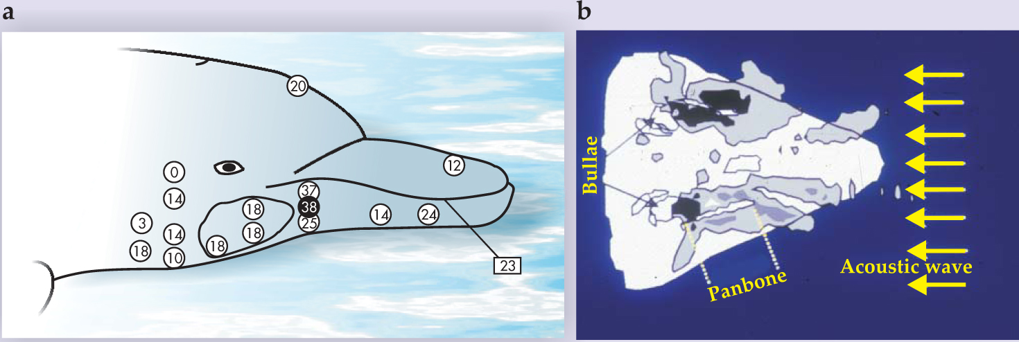 Figure 3. Dolphin hearing. (a) Piezoelectric crystals allow for measurements of hearing sensitivity as a function of location on the dolphin’s head. In this illustration, larger numbers indicate more sensitive hearing. The point of maximum sensitivity is indicated by the black-filled circle. The rectangular box corresponds to a piezoelectric clicker that was placed inside the dolphin’s mouth at the indicated location. (b) A numerical simulation maps the sound propagating into a dolphin’s lower jaw. Gray shaded areas indicate regions where the relative acoustic energy is high; darker gray means higher energy. Indicated in the simulation are the bullae or “ears” of the dolphin, and the panbone, a region in which the bone is much thinner than in the surrounding areas of the lower jaw.
