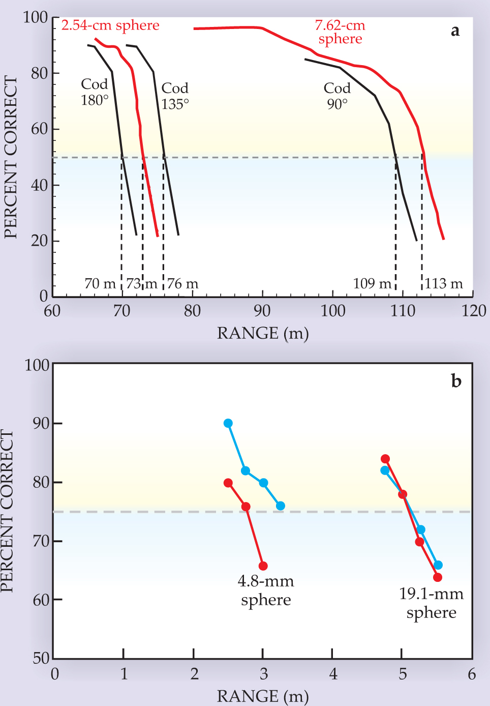 Locomotion patterns also affect an animal’s ability to echolocate. Figure 4a shows the measured detection range for a bottlenose dolphin to detect a 7.62-cm water-filled sphere and a 2.54-cm solid sphere. The same figure shows the predicted detection ranges for a 30-cm-long cod presented at various aspects with respect to the sonar beam; the ranges vary from 109 m when the cod is broadside to the incident signal down to 70 m when the cod is swimming directly away. 9 The theoretical results assume a noisy body of water, with the noise being generated by snapping shrimp.